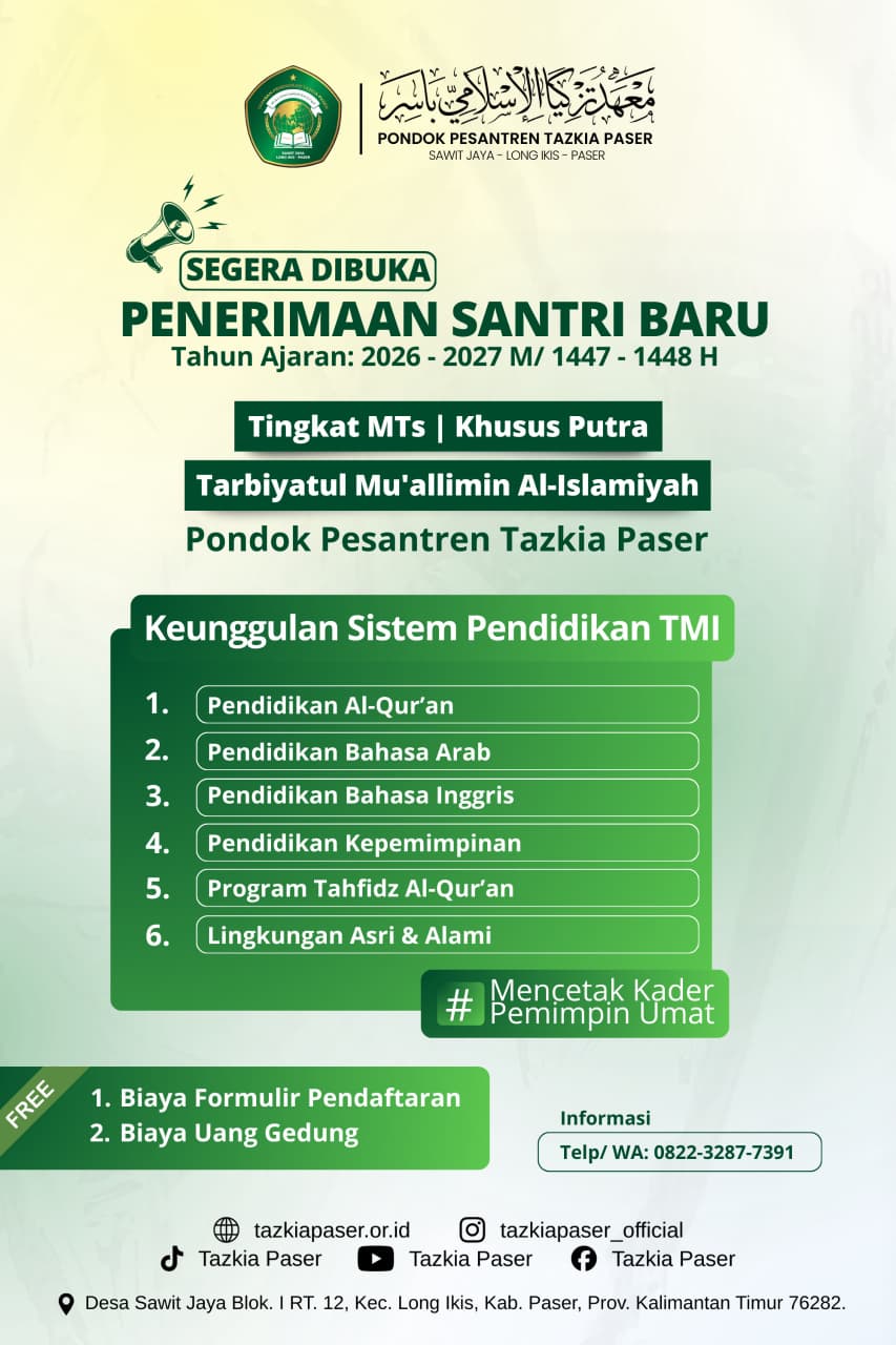 Melalui sinergi antara wakaf produktif, pengelolaan yayasan yang amanah, serta kepemimpinan yang berpengalaman, Pondok Pesantren Tazkia Paser diharapkan dapat menjadi pusat pendidikan Islam yang memberikan kontribusi nyata bagi pembinaan generasi berakhlak mulia, berilmu, dan siap mengabdi kepada agama, bangsa, dan negara.